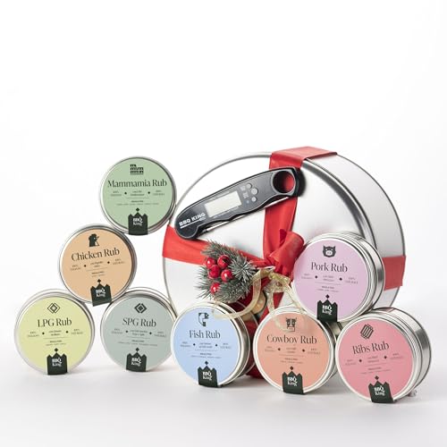 CONTENUTO - A casa riceverete un box contenente: 1 barattolo di latta richiudibile e salva freschezza da 70 gr per ogni gusto di Ribs Rub, Cowboy Rub, Chicken Rub, Pork Rub, LPG Rub, SPG Rub, Fish Rub e Mamma Mia Rub. Abbinato troverete il nostro Termometro da Cucina Digitale con Lettura Istantanea della Cottura, ideale per barbecue e grigliate. In meno di un secondo potrai rilevare la temperatura delle tue ricette preferite.,CHRISTMAS BOX - Un elegante box natalizio studiato nei minimi dettagli: il connubio perfetto tra qualità e ricercatezza per rendere magico il tuo Natale. Tutti i prodotti sono confezionati e sigillati in modo sicuro per garantirne lideale conservazione durante lanno; inoltre, sono imballati in una scatola resistente e per garantire lintegrità delle confezioni fino alla consegna a casa tua. Che sia il suo compleanno, Natale o San Valentino, questo bellissimo box sarà una grande sorpresa!,PERCHÈ SCEGLIERE I NOSTRI RUB - BBQ King lavora solamente con piccoli artigiani italiani per ricercare le migliori spezie sul territorio, come il miele abruzzese, la scorza di limone e arancia Bio siciliana, laglio nero di Voghera DOP e liquirizia DOP calabrese. Non usiamo alcun tipo di stabilizzanti, coloranti o agenti chimici allinterno dei nostri rub. Vogliamo diffondere la qualità Made in Italy dei nostri artigiani per trasmettere la cultura del barbecue.,GENUINITÀ - Tutta la linea di miscele di spezie BBQ KING è senza glutine. Utilizziamo tutti ingredienti di prima scelta che esaltano i sapori e gli aromi della carne o del pesce. La selezione delle materie prime è il punto di partenza su cui si costruisce tutto il nostro processo di lavorazione e, rispettando le vigenti normative in merito, effettuiamo delle scrupolose analisi sanitarie, qualitative e organolettiche.,BBQ KING - È una nuova gamma di Rubs studiata in base alle caratteristiche del taglio di carne che il Griller vuole cucinare, infatti, conoscendo la composizione della carne si puo sapere come reagiscono le spezie in base alle varie cotture. I nostri rub sono creati da una miscela di erbe e spezie finemente macinate, ricche di sfumature di gusto che daranno sapore alle tue ricette, da utilizzare con la tecnica dry rub effettuando un massaggio sulla superfice della carne.