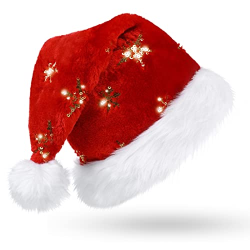 Flash e Peluche Cappello di Natale: Questo cappello di Natale è realizzato in velluto ad alta densità, con un tocco morbido e confortevole; Il suo rivestimento morbido è confortevole e caldo. Questo cappello di Natale di peluche di alta qualità è unottima scelta per la prossima stagione natalizia.,Fodera a doppio strato: Il cappello natalizio è decorato con fiocchi di neve, riflettendo la luce delle luci natalizie in modo luminoso e abbagliante, arricchendo efficacemente latmosfera natalizia.,Migliore decorazione di Natale: I nostri cappelli di Natale peluche sono grandi decorazioni per feste di Natale, feste in maschera, feste di Halloween, feste a tema e altro ancora.,Qualità eccellente: Ottima qualità, finitura pulita, luccicante collegato da linee solide, cappello di Natale in velluto di alta qualità.,Come regalo: Questo cappello di Natale peluche può soddisfare le diverse esigenze della vostra famiglia. Indossa questo simpatico cappello di Natale e goditi il calore e la gioia della vacanza con la famiglia e gli amici.