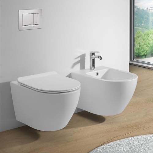 Coppia Sanitari Sospesi Tokyo Rimless Bianco Opaco WC E Bidet Con Sedile Soft-Close