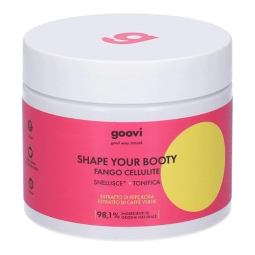 FANGO CELLULITE: Shape Your Booty è il trattamento studiato per agire sugli inestetismi della cellulite, adatto a tutti i tipi di pelle, senza fonti di iodio,ESTRATTO DI PEPE ROSA: la sua formula con estratto di Pepe Rosa ti permette di avere risultati già dopo sole 2 settimane, la pelle risulterà più elastica, levigata e tonica, con una riduzione degli accumuli adiposi e dell’effetto a buccia d’arancia,CAFFÈ VERDE: con il 98,1% di ingredienti di origine naturale, questo fango è arricchito anche con estratto di Caffè Verde che aiuta a ridefinire la silhouette, riducendo la circonferenza di cosce e fianchi,MODO DUSO: applicare uno strato generoso di fango sulle zone che si desidera trattare (cosce, glutei, pancia, fianchi), lasciare in posa per 30 minuti quindi risciacquare con abbondante acqua tiepida massaggiando delicatamente,GOOD, EASY, NATURAL: Goovi si impegna a creare formule CLEAN e VEGAN con ingredienti delicati per la pelle, sostenibili, e con attivi di origine naturale selezionati, per offrirti prodotti pieni di GOOD VIBES