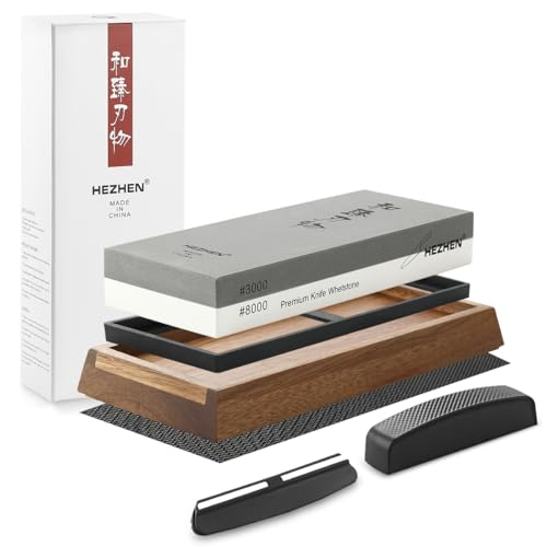 HEZHEN Pietra Affilacoltelli Professionale, Pietra per Affilare al Corindone Bianco, Doppia Faccia Grana3000/8000, con Guida Angolare, Base in Legno