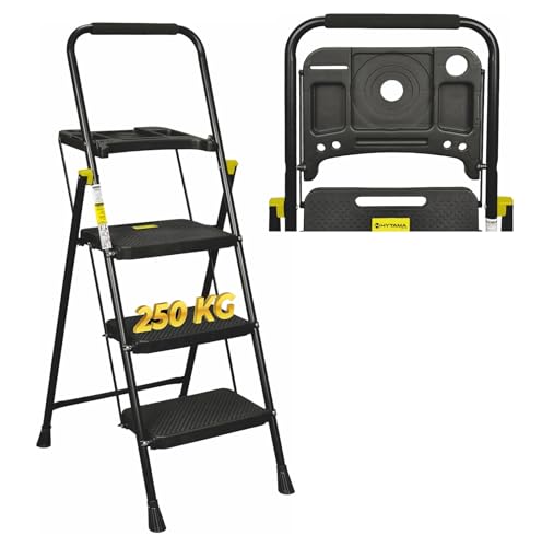 HYTAMA Scala Scaletta Pieghevole 3 Gradini Nero PLUS con Portaoggetti con Piedini Antiscivolo, Struttura in Acciaio, Impugnatura in Spugna, Leggera, Multiuso, Certificata EN14183 testata fino a 250Kg