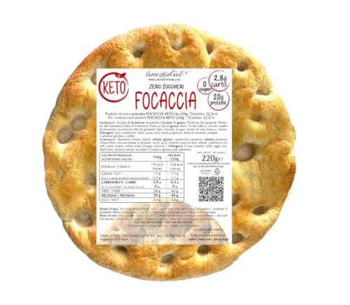 KETO FOCACCIA ad alto contenuto di PROTEINE, alto contenuto di FIBRE, ridotto contenuto di CARBOIDRATI, ZERO ZUCCHERI.,Solo 2,8% di carboidrati e ricca di proteine: ben 44 g per base da 220g. Ti sazia e ti nutre!,Impasto speciale ricco di fibre: con frumento vitalizzato super digeribile,100% Artigianale, OGM-free e Senza Zuccheri: qualità che si sente al primo morso!,Facile e veloce da preparare: basta scaldarla in forno per esaltare il sapore (microonde vietato!)… oppure gustala anche così com’è!,Cuoci a 230° per 5/6 minuti, quindi farcisci a tuo piacimento! Provala con salmone e avocado, mortadella + pistacchi + burrata, oppure gustala con bresaola, rucola e scaglie di grana
