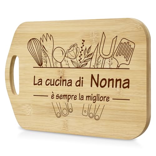 Regalo per Nonna Natale: Un tagliere in bambù con la scritta “La cucina di Nonna è sempre la migliore”. Un regalo personalizzato per la nonna, che esprime il tuo amore e la tua gratitudine per lei.,Design Multifunzionale su Entrambi i Lati: Un lato è stampato con inchiostro indelebile per una finitura attraente e resistente, ideale per presentare e servire i piatti. Laltro lato presenta scanalature per il drenaggio del succo durante il taglio, mantenendo pulito il piano di lavoro.,Regalo Pratico e Decorativo per la Nonna: Il tagliere per nonna con dimensioni di 31,2 × 22,0 × 1,0 cm, è sia un accessorio indispensabile in cucina che un elegante oggetto decorativo quando non viene utilizzato.,Regalo Nonna per Tutte le Occasioni: Questo tagliere nonna è un regalo premuroso e utili per molteplici occasioni. Perfetto come regalo di Natale per la nonna, un idee regalo festa della nonna, regali per la nonna da nipote dai nipoti, un regalo compleanno nonna e una brillante ispirazione per regali nonna o regali di tutti i giorni.,Materiale Organico Naturale: Realizzato in bambù organico naturale puro al 100%, questo tagliere per nonna è ecologico e salutare. A causa delle variazioni del bambù naturale, il colore e le venature di ogni tagliere possono differire leggermente dallimmagine.