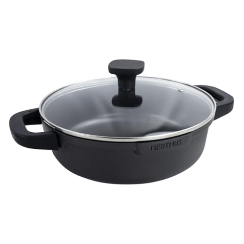 NERTHUS FIH 1557 Casseruola Bassa in Alluminio Fuso con Rivestimento Antiaderente Quantanium Compatibile con Induzione, Gas e Vetroceramica con Coperchio in Vetro e Manici in Silicone Rimovibili