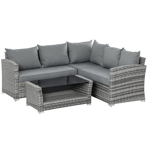 Outsunny Set Mobili da Giardino in Rattan PE da 4 Pezzi, Salotto con Divano Angolare e Tavolino con Vetro, Cuscini Imbottiti e Sfoderabili, Grigio
