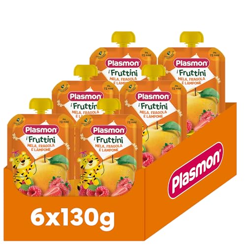Indicato a partire dal 12° mese di età,Gustosa merenda di mela fragola e lampone, con vitamina C e i soli zuccheri della frutta,I Fruttini Plasmon sono prodotti in Italia con ingredienti selezionati,6 pratiche confezioni richiudibili e riciclabili da 130g ciascuna, ottime per il consumo fuori casa,Senza coloranti e conservanti come per legge
