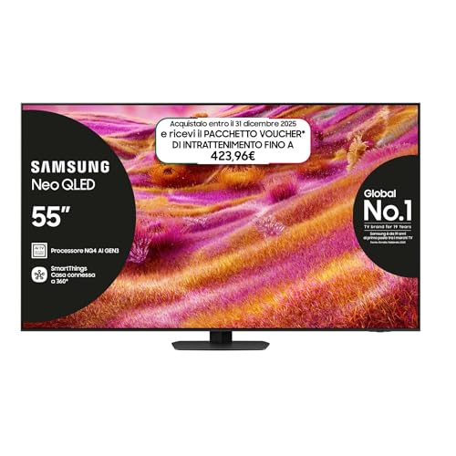 Smart TV 55 pollici, Processore NQ4 AI Gen3 con risoluzione 4K AI Upscaling Pro per sfumature di colore vivide e realistiche, Nuove funzioni AI: Click to Search per info istantanee su ciò che vedi, AI Mode ottimizza immagine e suono in tempo reale,Quantum Matrix Plus per resa cromatica precisa anche in scene scure e luminose, AI Motion Enhancer Pro rende nitido il movimento di oggetti e testi, Immagini fluide nel gaming con Motion Xcelerator 165 Hz, Tecnologia Glare Free per riflessi ridotti,OTS+: Audio surround 3D sincronizzato con lazione per un’esperienza immersiva, Q-Symphony per una perfetta armonia tra la soundbar (non inclusa) e gli altoparlanti del televisore, Adaptive Sound Pro per un suono calibrato in base ai contenuti,Smart Hub riunisce film,giochi e programmi in un unico posto, Gaming Hub ti permette di accedere alle migliori piattaforme di gaming, Smart Things di controllare tutti i tuoi dispositivi dalla TV,Contenuto: 1x Samsung Smart TV 55 Serie QN94F, Neo QLED 4K, Include doppio telecomando, cavo di alimentazione e manuale di istruzioni, Dimensioni con base: (LxAxP): 122,7 x 70,5 x 26,9 cm, Colore: Titan Black