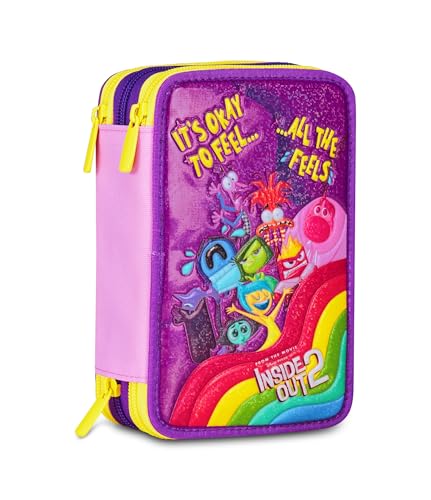 Seven Inside Out 2 Astuccio Scuola 3 Zip, Viola, Portapenne Triplo Scomparto Completo Di Penne, Matite, Colori, Accessori Zaino, Scuole Elementari, Bambina