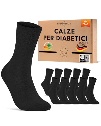 COMPOSIZIONE DEL MATERIALE: Le nostre calze per diabetici per donna e uomo sono composte da 80% cotone, 17% poliammide e 3% elastan – la miscela perfetta per un comfort traspirante e delicato sulla pelle. Il materiale è traspirante e assicura un trasporto ottimale dellumidità, mantenendo i tuoi piedi asciutti e freschi. La combinazione di fibre durevoli e stabili garantisce qualità e comfort in un unico prodotto – ideale per la tua salute.,VESTIBILITÀ PERFETTA: Queste calze si adattano perfettamente ai tuoi piedi – senza scivolare né stringere. La lavorazione senza cuciture evita punti di pressione scomodi, e il materiale elastico assicura che le calze non stringano. Sia per donne che per uomini, potrai godere di un comfort duraturo durante tutto il giorno. Così puoi essere certo che queste calze resteranno sempre al loro posto senza stringere.,AMICHE DELLE VENE: Le nostre calze per diabetici sono progettate appositamente per essere amiche delle vene e sostenere la tua salute. Sono realizzate in modo da evitare punti di pressione e da non comprimere gambe e piedi. Il materiale traspirante e regolatore del clima contribuisce a farti sentire bene tutto il giorno – ideali per diabetici e per chiunque tenga alla salute dei propri piedi.,LA TUA SCELTA MIGLIORE: Che siano per donne o uomini, con le nostre calze per diabetici fai la scelta migliore per i tuoi piedi. Queste calze uniscono la massima qualità a un design studiato, che è durevole, stabile ed elastico. Concediti il comfort che meriti e scegli calze che si prendono cura della tua salute – e che sono incredibilmente piacevoli da indossare.