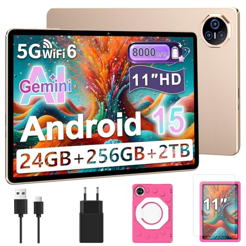 Tablet Android 15, 11 Pollici Tablet per Bambini, 24 GB+256 GB/2 TB, Octa-Core, Gemini AI/Widevine L1, 8000 mAh, 13 MP+5 MP, Tablet PC Grandi, Dimensioni con Custodia Protettiva in Silicone EVA-Rosa