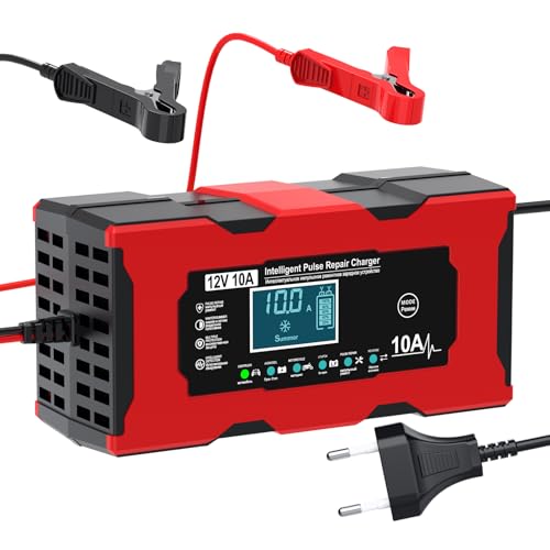 VELOGK Caricabatterie Auto, 10A 12V Mantenitore Batteria Moto Intelligente Mantenitore di Carica Moto Auto con Schermo LCD Carica Batterie per Auto Moto Barche AGM Caricabatterie veloci