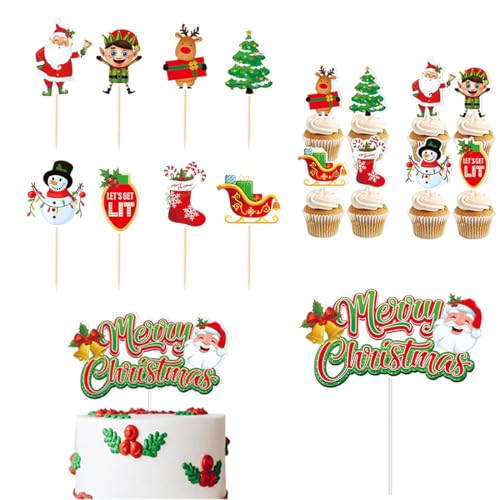 YOFDAL 9 Pezzi Topper per Torte Natale Kit, Decorazione Fiocco di Neve Pupazzo di Neve Babbo Natale Renna Cupcake Topper per Decorazioni Torta