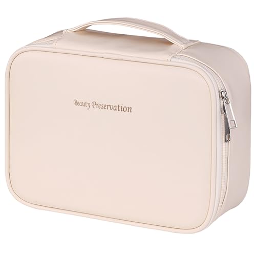 SYEXDZON Borsa da Toilette da Appendere, Borsa da Viaggio di Grande Capacità, con Pannello Rimovibile per Pennelli da Trucco e Divisori Staccabili, Organizer per Cosmetici (Beige)
