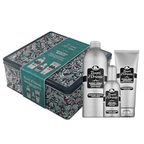 Tesori d'Oriente, Muschio Bianco Set Doccia, Include Doccia Crema 250 ml, Bagno Crema 500 ml e Profumo Aromatico 100 ml, Fragranze con Note Ambrate e Armoniose che Durano a Lungo, Confezione Regalo