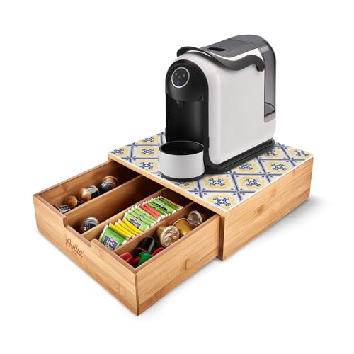 Avilia - Porta Cialde Caffè e Porta Capsule in Bambù con Ripiano in Vetro Maioliche di Sorrento, Organizer per Angolo Caffè e Tè 30x30x10cm, Elegante e Compatto per Casa e Ufficio