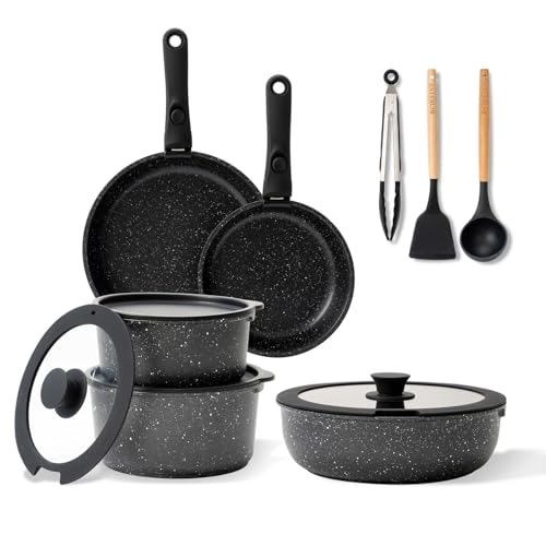 BOREINE Set di Pentole e Padelle 14 Pezzi, Batteria Pentole Antiaderente Senza PFOA e PTFE, Manico Removibile, Compatibile Induzione, Gas, Forno e Tutti i Piani Cottura, Nero