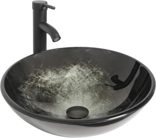 YU YUSING Lavabo da Appoggio in Vetro, Lavandino Bagno Rotondo con rubinetto, Lavabo Bagno Moderno, Lavello Cucina, Bagno, Cucina, Ospiti, WC, Nero, 42 x 42 x 14 cm