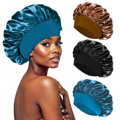 PAEFIU 3 Pezzi Cuffia Seta Capelli Notte, Cuffia Capelli Ricci Notte Cuffia in Seta per Dormire, Silk Bonnet per Donna(Nero,Blu,caffè)